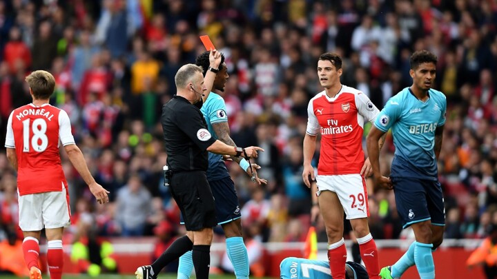 Xhaka's first sending off for Arsenal came in their meeting with Swansea in October, when he cynically tripped Modou Barrow to halt a counter-attack. It made for a nervous finale for Arsene Wenger's side, but they held on to their 3-2 advantage to claim the win.
