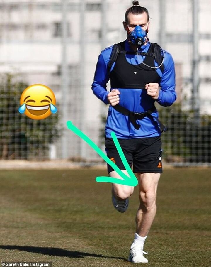 Bale then drew a green arrow pointing at his now more bulging thigh muscle along with a crying-laughing emoji.