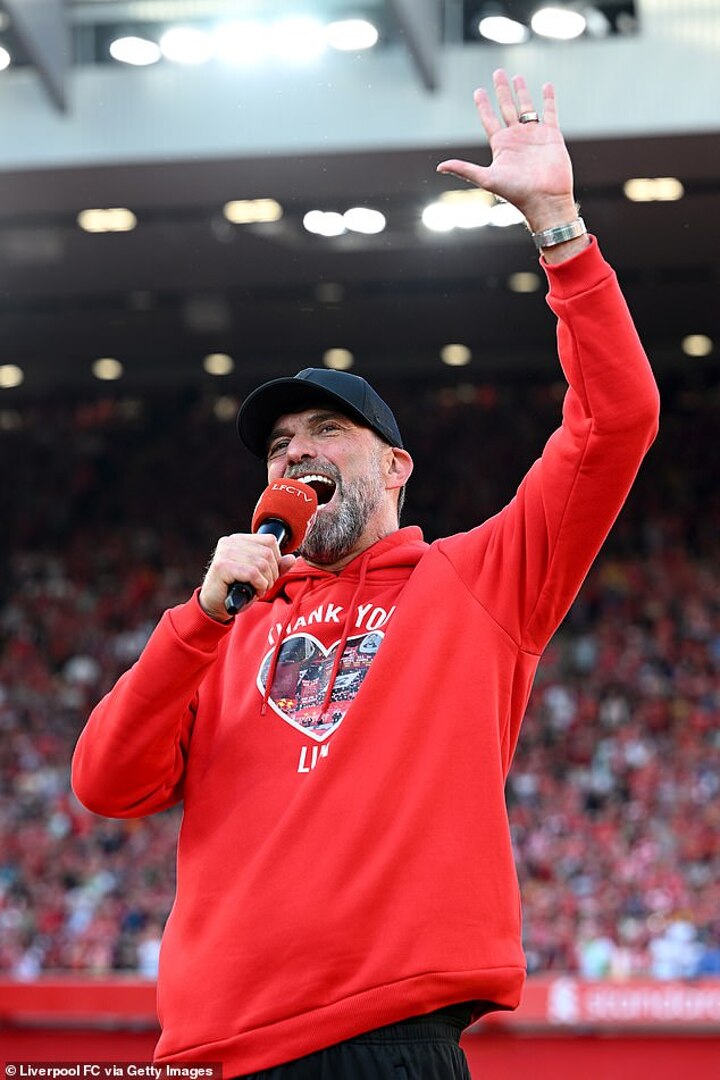 After embracing all of his players, Klopp spoke to the Anfield crowd and encouraged them to get behind incoming boss Arne Slot, who revealed on Friday that he will be replacing Klopp next season.
