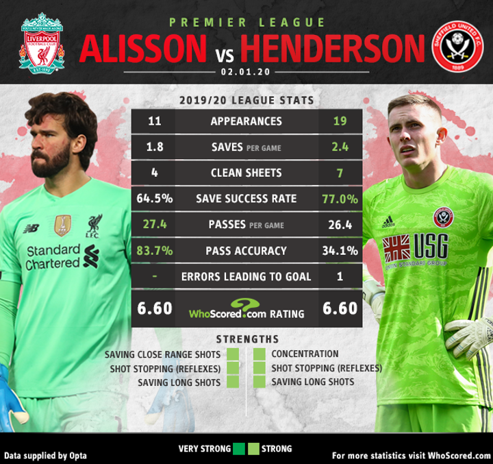 Check out the Head to Head stats between Alisson and Henderson, who will keep a clean sheet today?