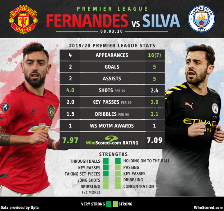 Check out the Head to Head stats between Bruno Fernandes and Bernardo Silva. The two Portuguese midfielders are to face off in the Manchester Derby. Who would you rather have in your XI?