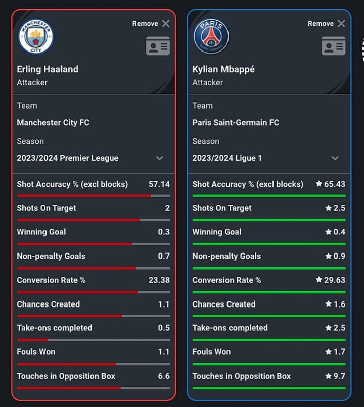 Between Haaland and Mbappe, the latter comes out clear in every department, especially in his 2.5 take-ons completed, touches in the option box and conversion rate of 29.63%.