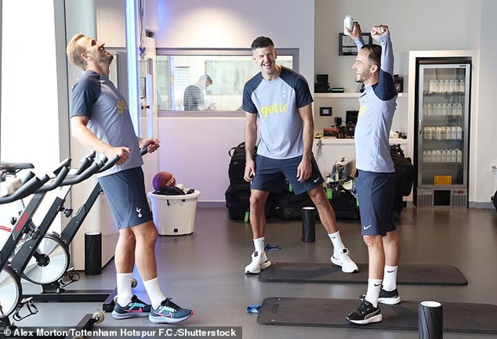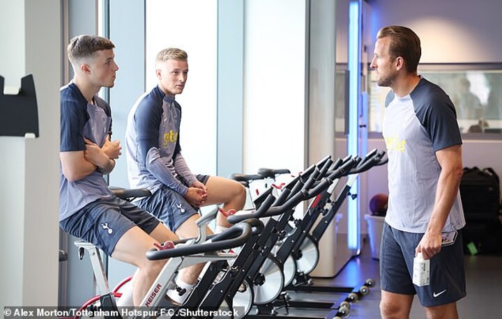 The England striker was pictured laughing with Fraser Forster and new team-mate James Maddison, who was also at training for the first time following his £45million move from Leicester.