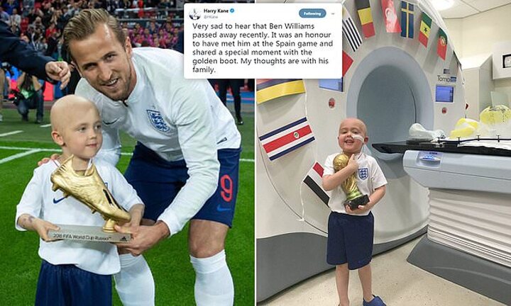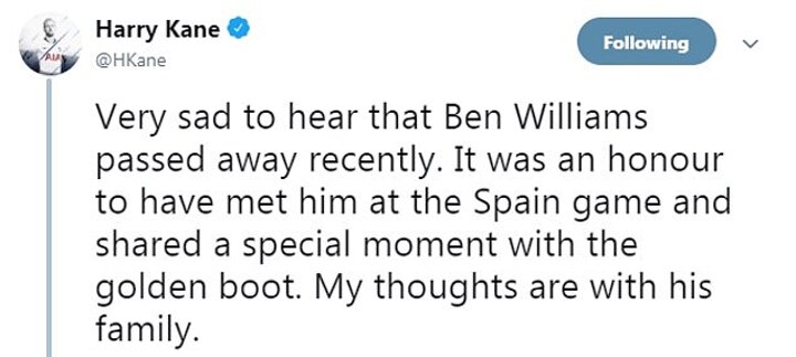Kane tweeted today: 'Very sad to hear that Ben Williams passed away recently. It was an honour to have met him at the Spain game and shared a special moment with the golden boot. My thoughts are with his family.'