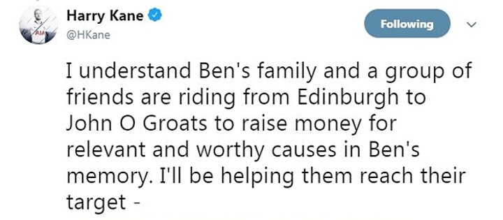 Kane was 'very sad' to hear of Ben's death and will be supporting charity fundraising efforts