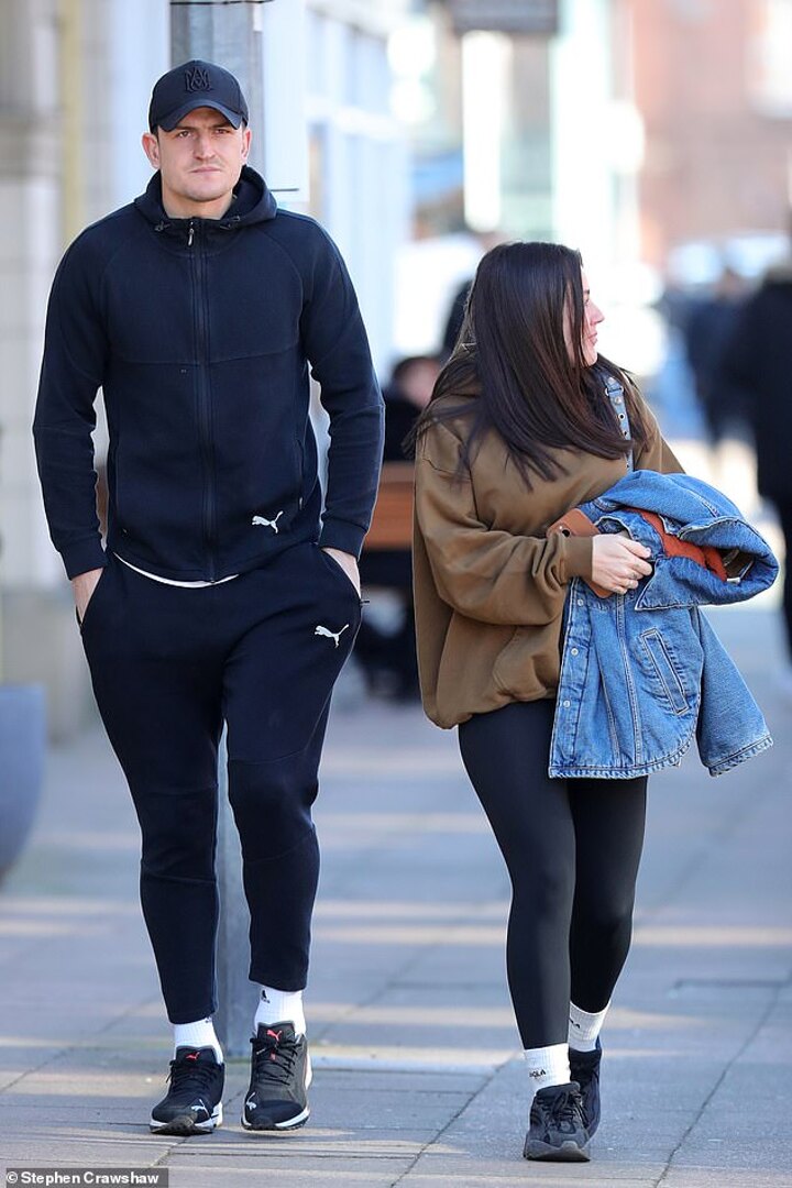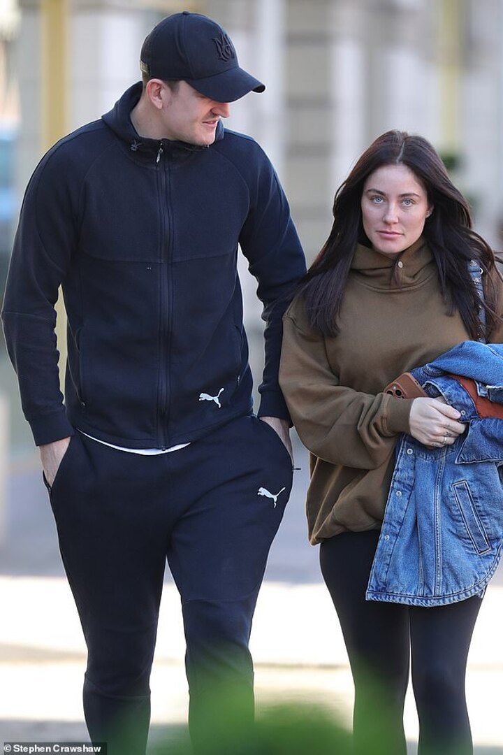 Harry Maguire took a break from training to grab lunch with his wife Fern Hawkins in Wilmslow, Cheshire on Thursday.