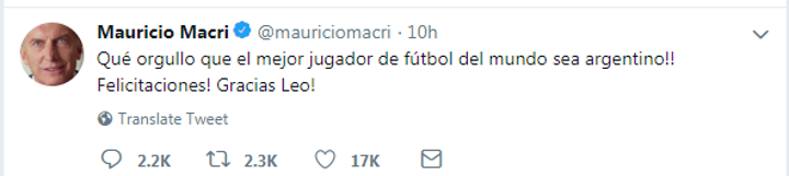 "What a pride that the best football player in the world is Argentine! Congratulations! Thanks Leo!", Macri wrote in his Twitter account.