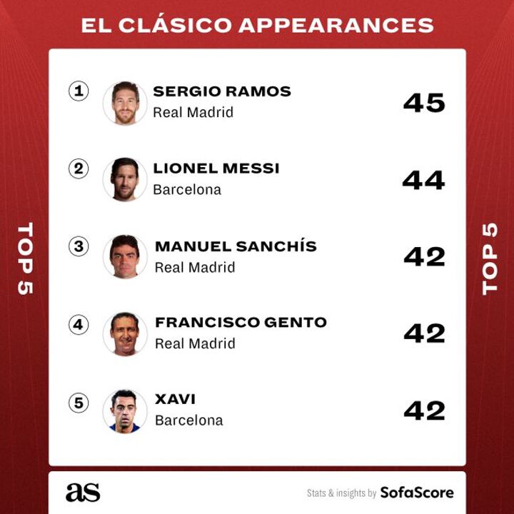 Having already scored more goals - 26 - and supplied more assists - 14 - than any other player in Clásico history, Messi will draw level with Sergio Ramos as the fixture’s highest ever appearance maker, with the Madrid captain unable to play because of a calf injury.