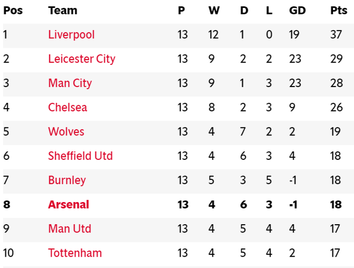 Ljungberg faces a tall order to turn things around with a squad low on confidence - but here's a reminder of how the table looked when Arsenal decided to part company with Emery.