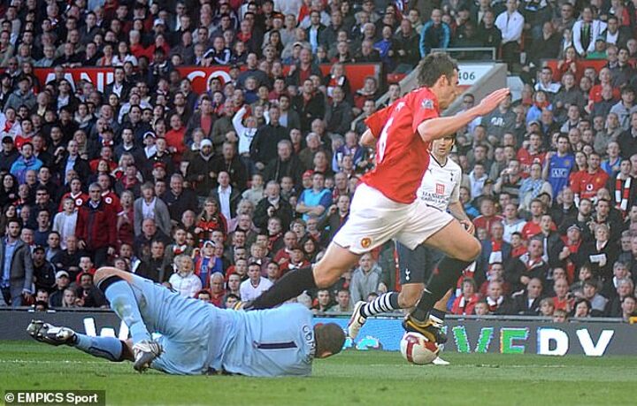 Webb gave a penalty but now criticises his decision, saying: 'I could see Carrick got there first and then the goalkeeper clattered into him. It was really an easy penalty award.