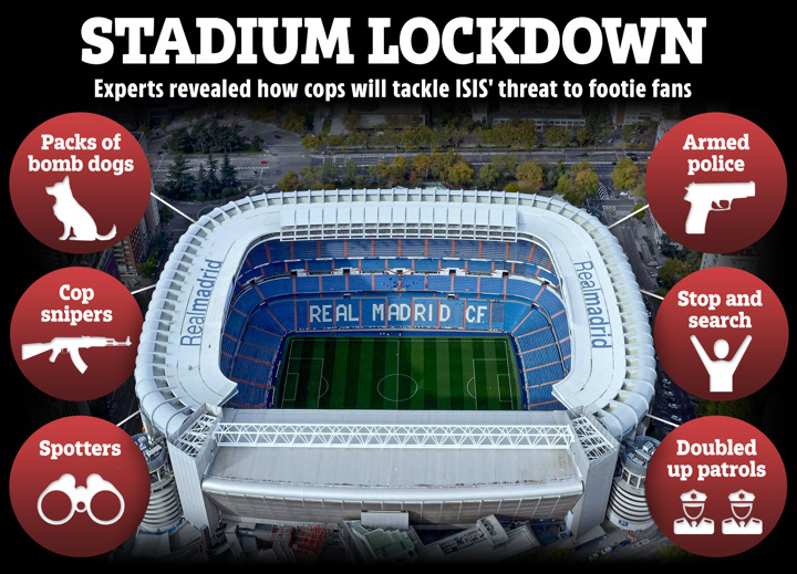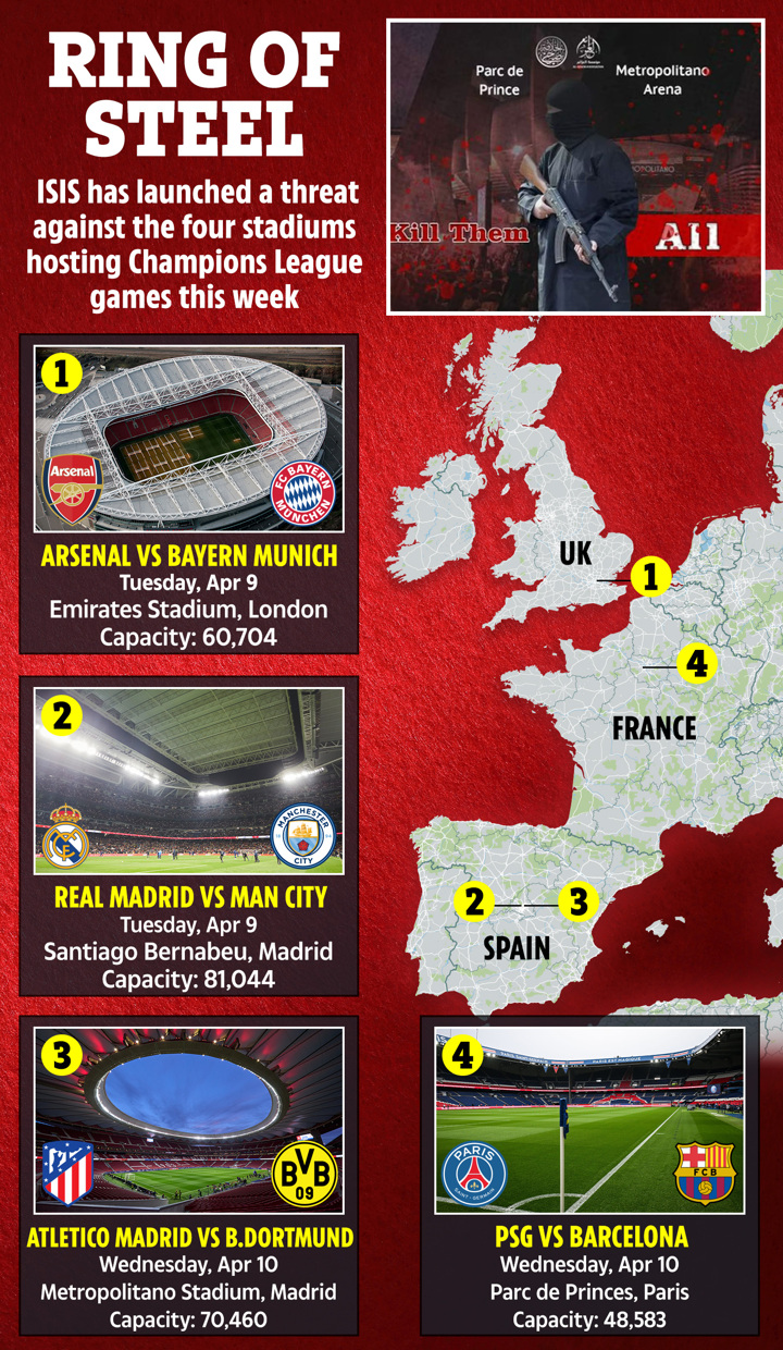 But last night, ISIS released a warped propaganda poster claiming they were ready to launch attacks at Arsenal's Emirates Stadium, Real's Santiago Bernabeu, Atletico's Metropolitano Stadium and PSG's Parc de Princes.