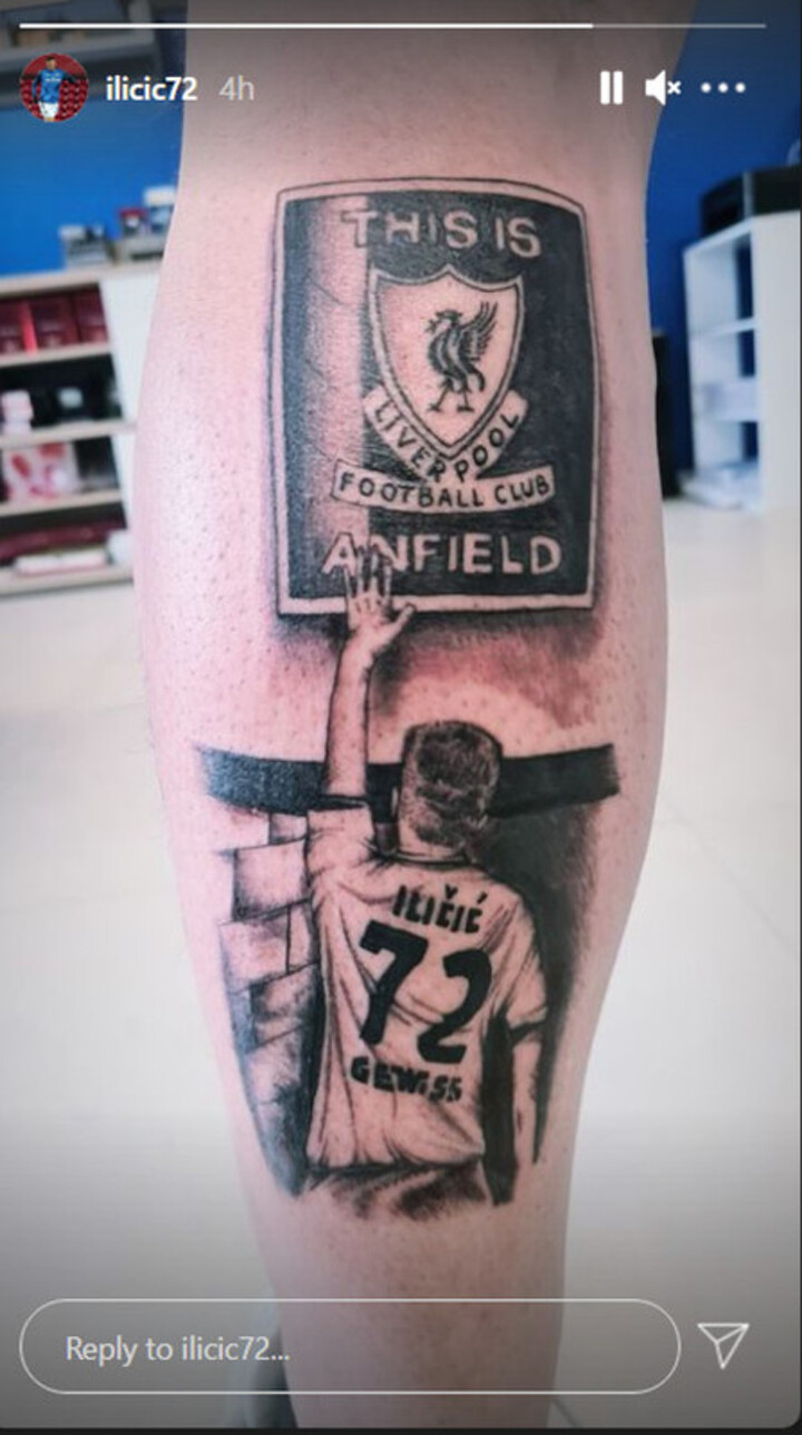 The tattoo represents Ilicic from the back, holding up one hand to touch the ‘This is Anfield’ sign that leads from the locker rooms to the pitch.