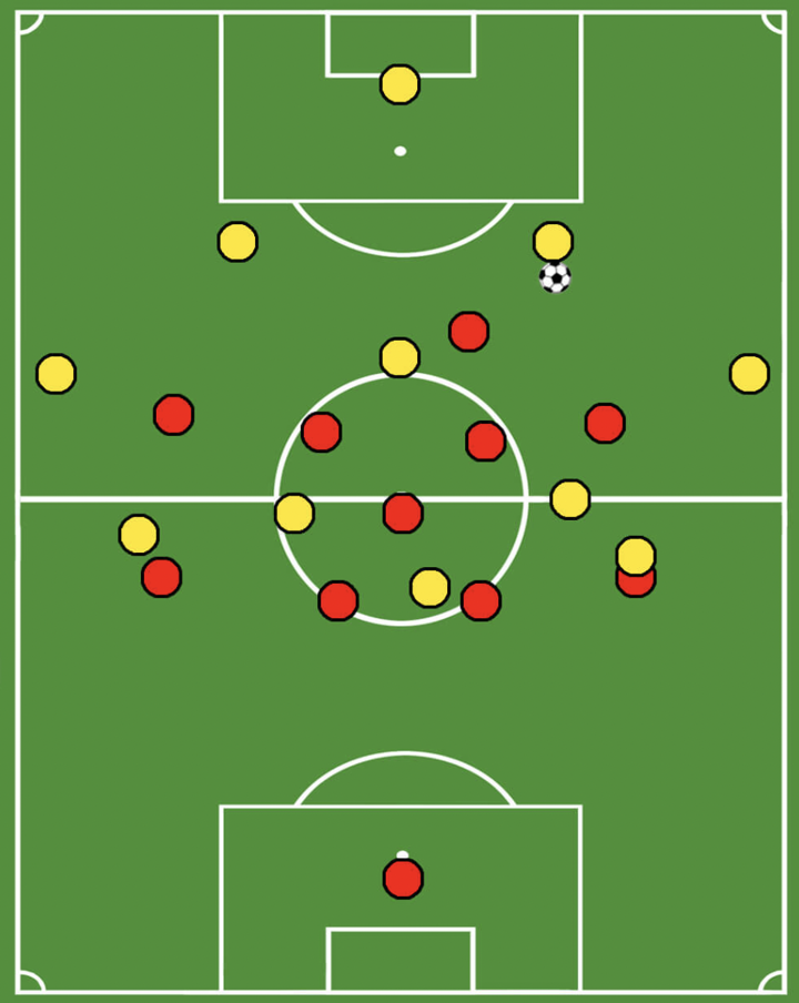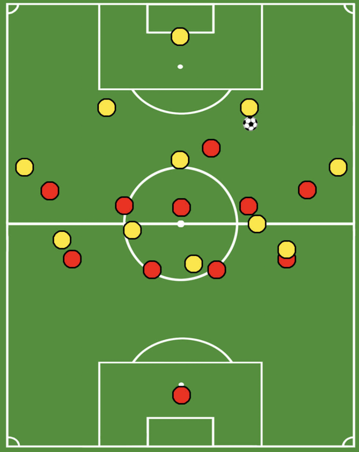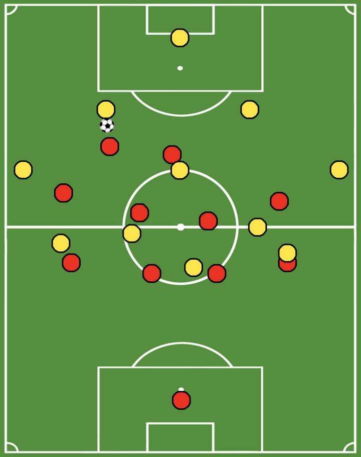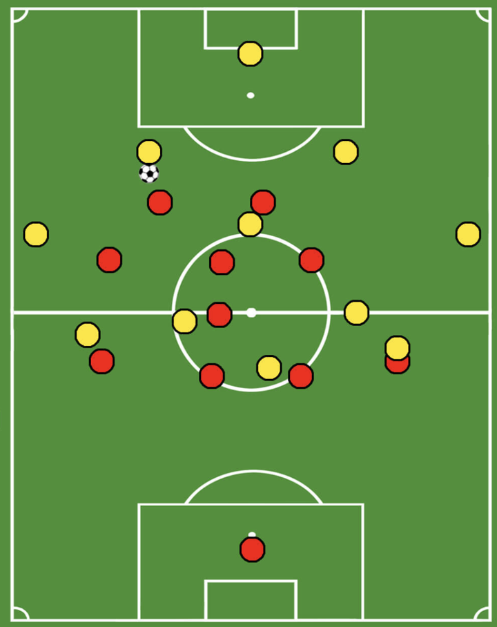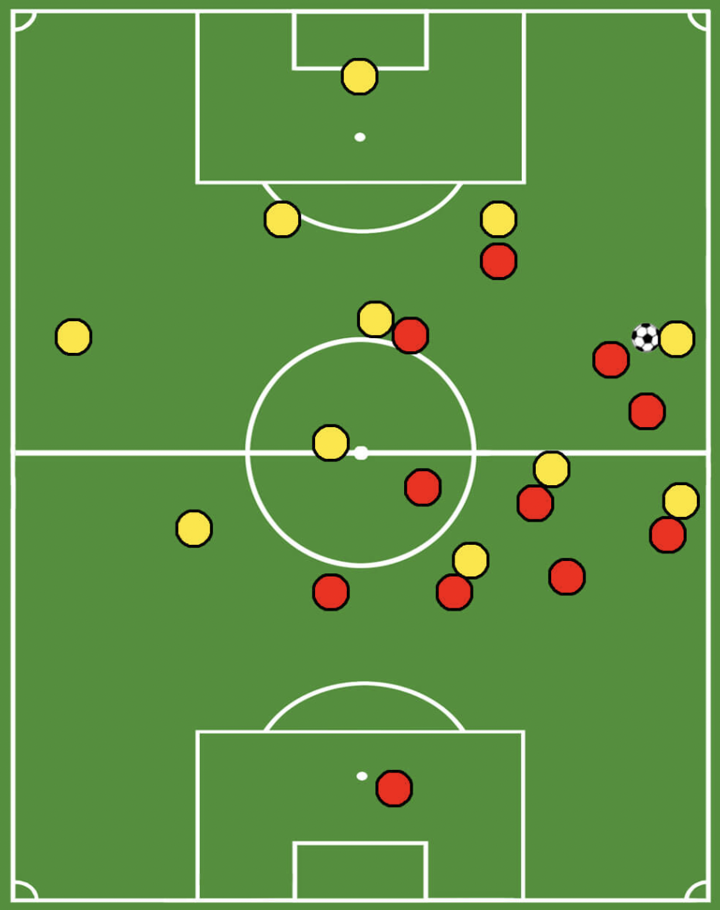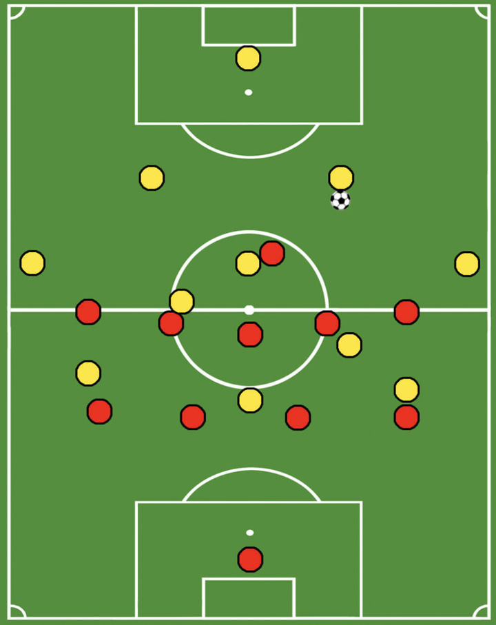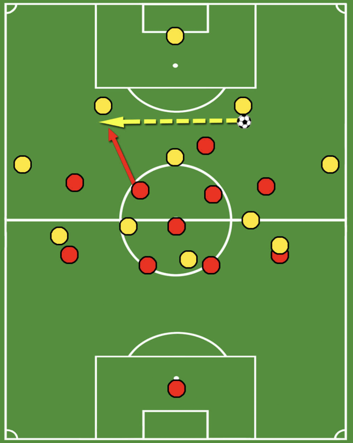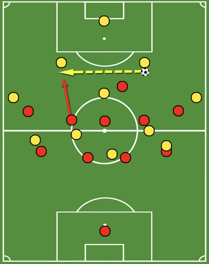 Another important feature of this press is the back press. Whenever the first line of the press is overplayed, the attackers need to press backwards in order to reduce time and space for the ball-carrier.
