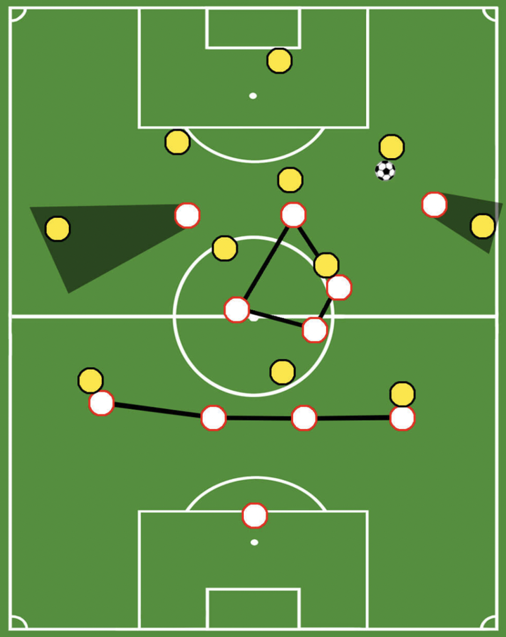 Therefore, the wide forwards are supposed to defend high up the pitch. Since this creates space on the wing, the full-backs must be ready to move up the line to press as well. Ideally, though, the wingers use their cover-shadow to prevent any passes into wide areas to be played. The striker meanwhile presses the central defender as well and therewith only leaves a central passing lane towards the central midfielder open.