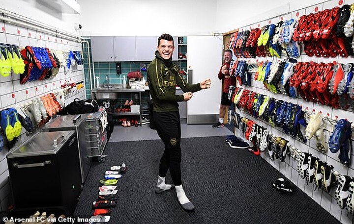 Arsenal fans were given a rare glimpse into the club's bootroom at the training ground as Pierre-Emerick Aubameyang, Henrikh Mkhitaryan and Co mulled over which boots to put on for training.