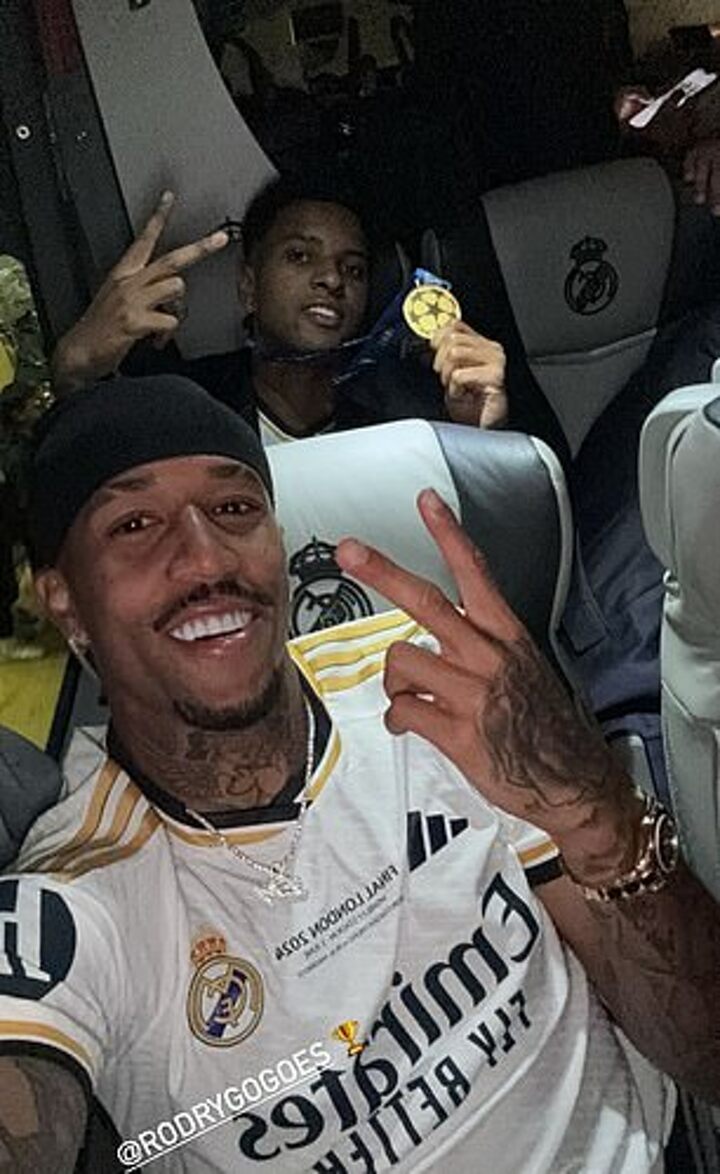 Vinicius posted a snap of himself lapping up the party atmosphere on the team bus, as did Antonio Rudiger and Eder Militao, with the group flashing their Champions League medals while on the team bus.