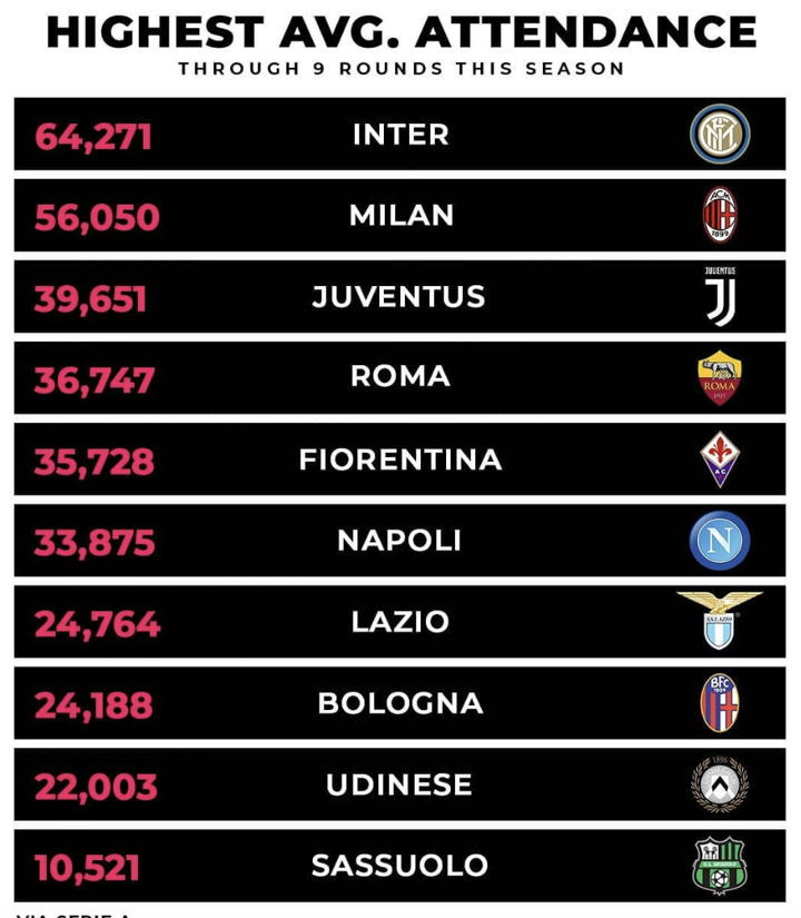 Inter and Milan, who share San Siro together, remain the leaders of most attendance in Serie A.