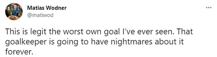 Another added: 'This is legit the worst own goal I've ever seen. That goalkeeper is going to have nightmares about it forever.'