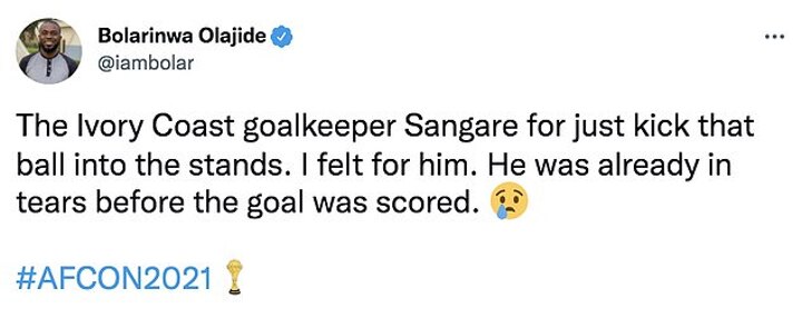 Meanwhile, some fans felt sorry for Ali Sangare. One user wrote: 'The Ivory Coast goalkeeper Sangare for just kick that ball into the stands. I felt for him. He was already in tears before the goal was scored.'