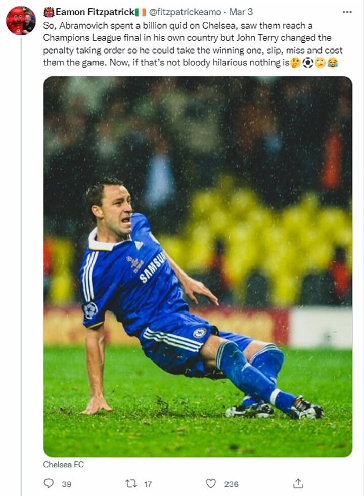 'But John Terry changed the penalty taking order so he could take the winning one, slip, miss and cost them the game. Now, if that's not bloody hilarious nothing is.