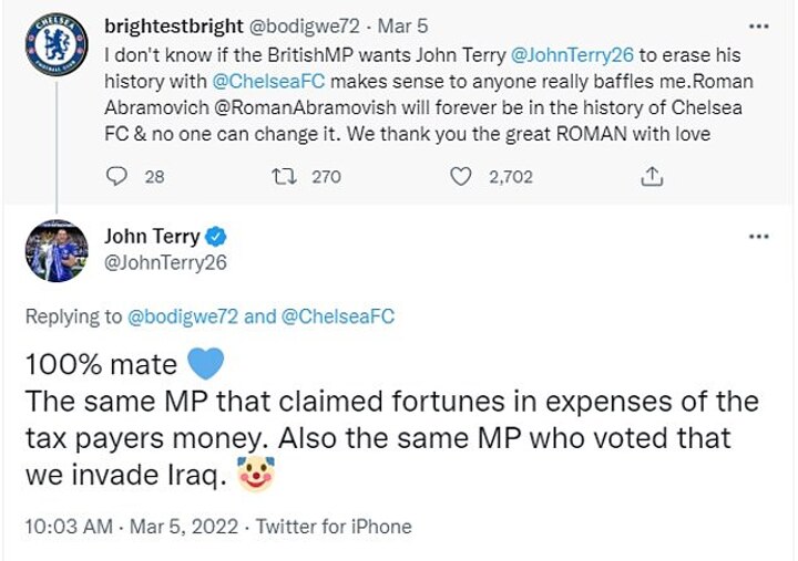A Chelsea fan responded saying: 'I don't know if the British MP wants John Terry to erase his history with @ChelseaFC makes sense to anyone really baffles me. Roman Abramovich will forever be in the history of Chelsea FC & no one can change it. We thank you the great ROMAN with love'.