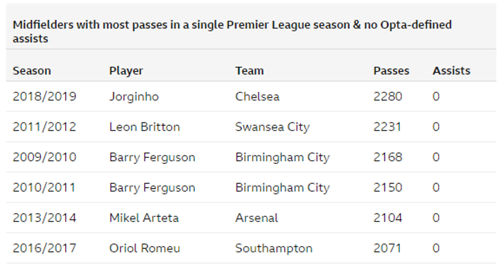 Chelsea star Jorginho has set a new Premier League record for the most passes made in one Premier League season without recording a single assist.
