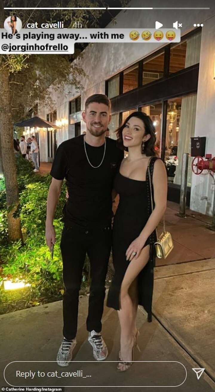 Jorginho's girlfriend Catherine Harding dismissed cheating claims as she joined the Chelsea ace in Miami and shared a defiant loved-up snap with him after fans spotted his profile on celebrity dating app Raya.