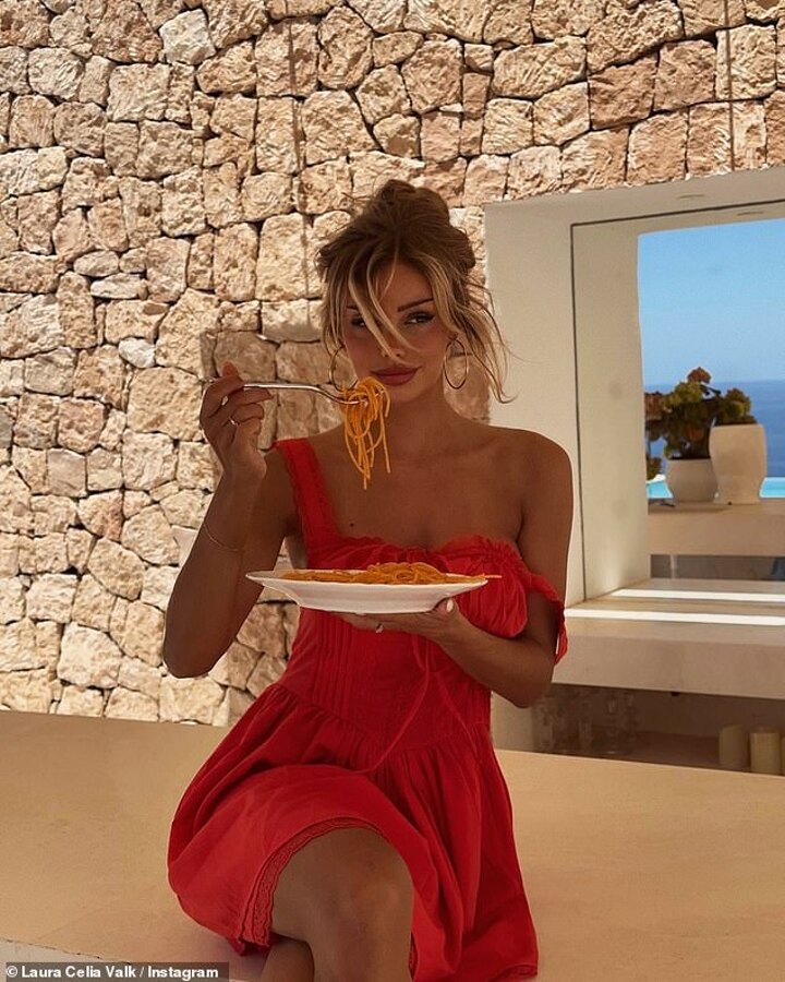 The playful pictures, shared a couple of days before England's next Euros clash again Slovinia, show the blonde beauty enjoying a plate of spaghetti.