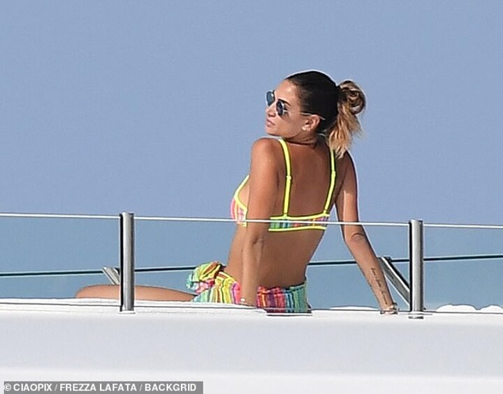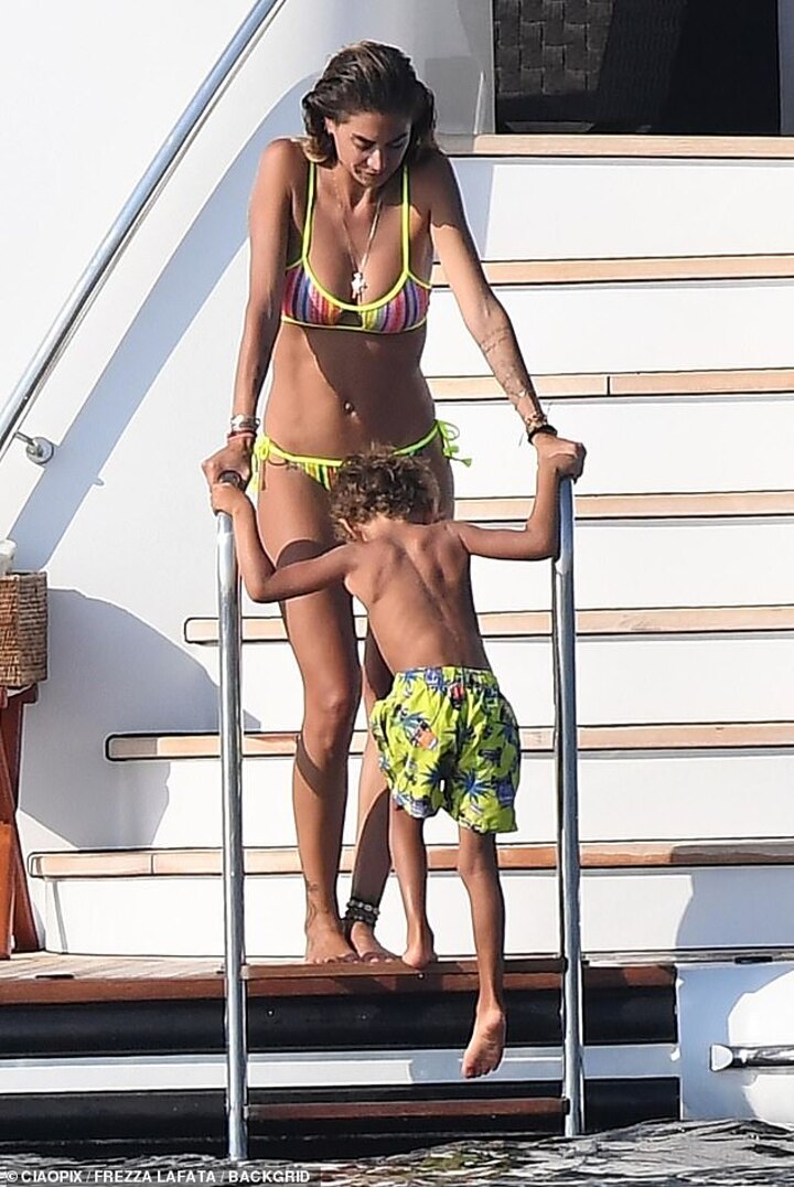 The Sassuolo midfielder, 32, showcased his hunky tattooed frame as he spent time with his Sports Illustrated model love, 33, and their son Maddox, five.