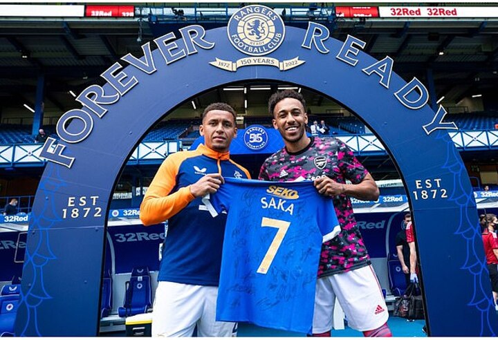 Rangers made a touching tribute to Arsenal and England star Bukayo Saka by giving a signed No 7 shirt to his club teammate Pierre-Emerick Aubameyang before a pre-season friendly with the Gunners on Saturday.