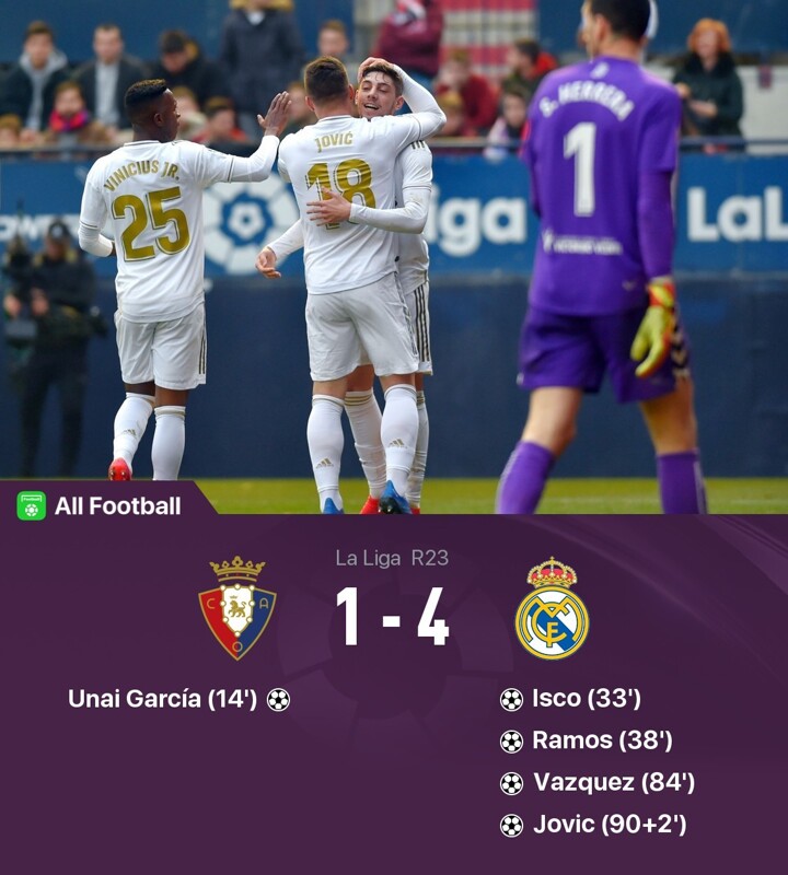 Sergio Ramos, Lucas Vazquez and Luka Jovic scored for Real Madrid after Isco cancelled out Unai Garcia's opener for Osasuna at El Sadar.