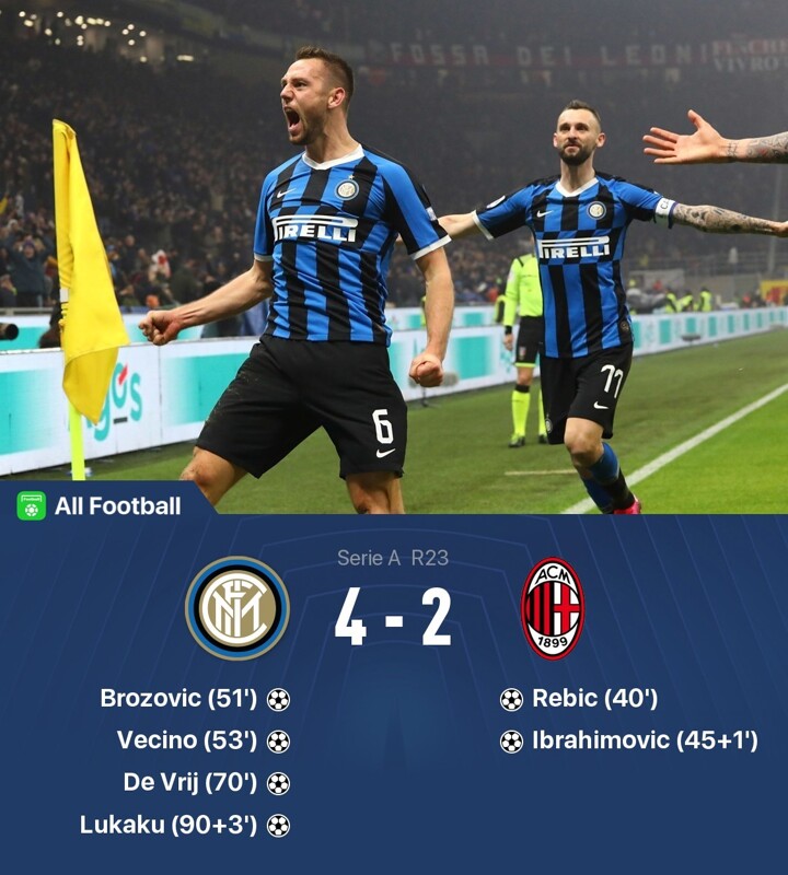 Inter 4-2 Milan: Ibra's effort in vain as huge comeback helps Inter surpass Juve
