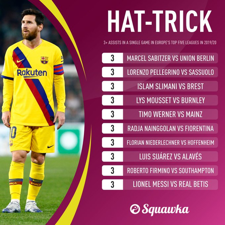Messi's 10th player to have a hat-trick of assists in Top 5 leagues this season