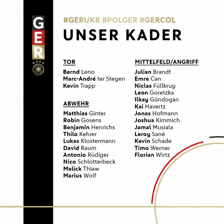 Germany squad for the upcoming games against Ukraine, Poland and Colombia
