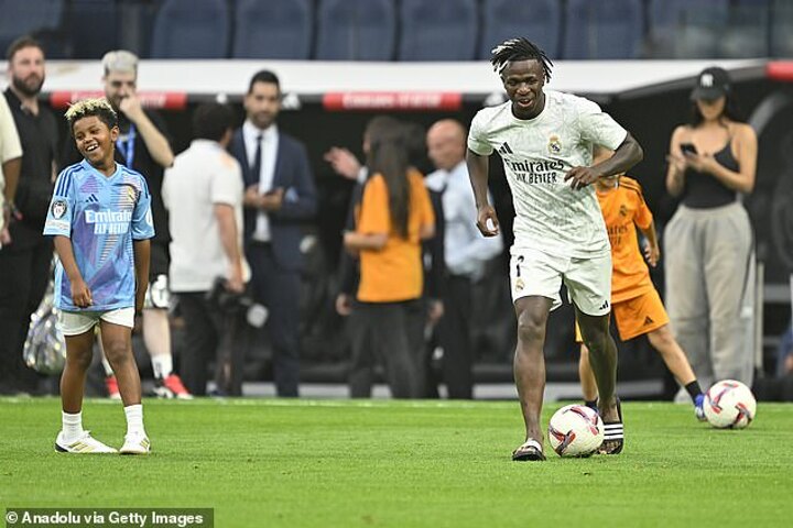 And on Sunday, Saint got the full matchday experience as he walked onto the Bernabeu pitch alongside Vinicus before the Spanish giants beat Real Valladolid 3-0.