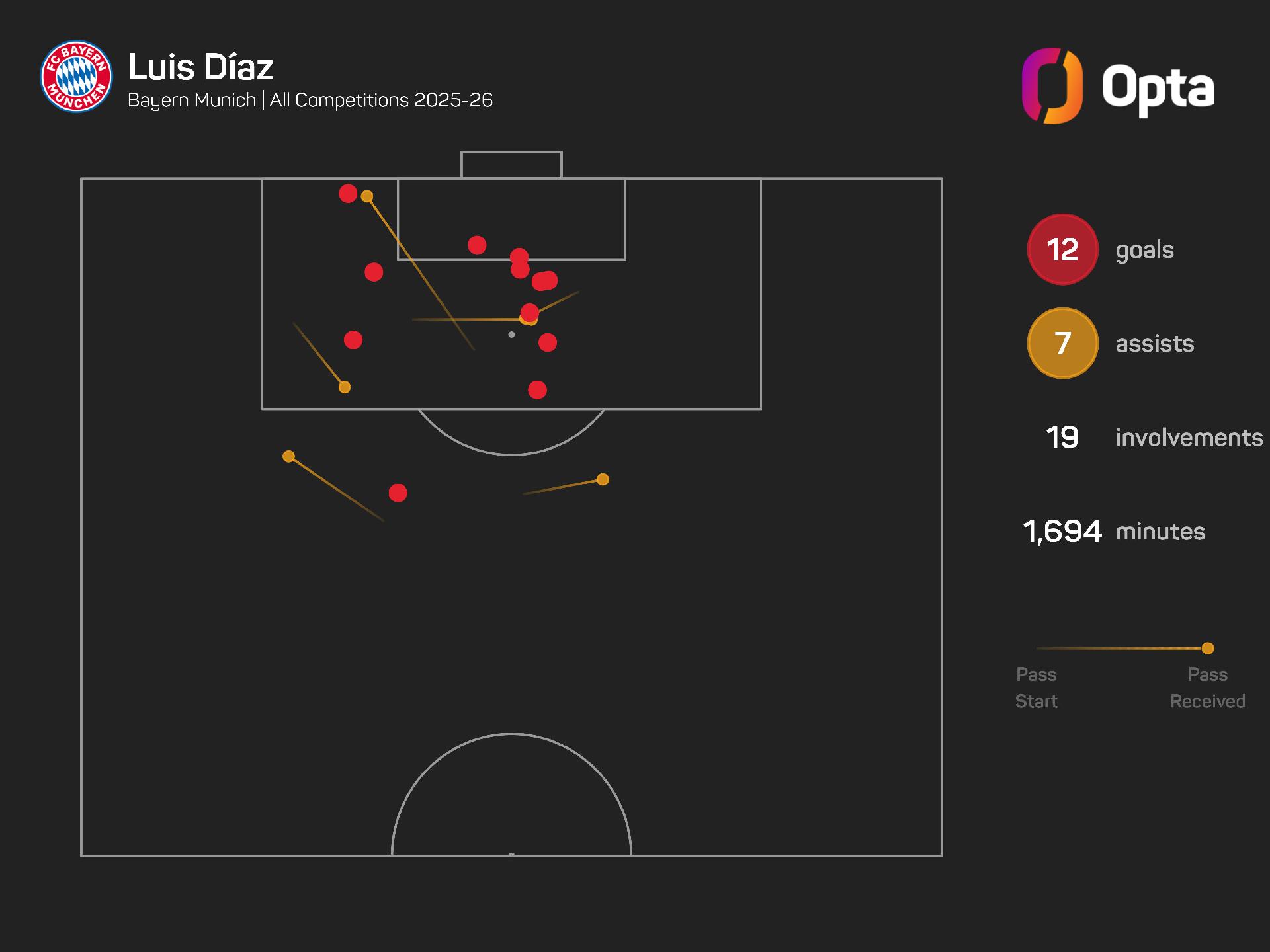 The Colombian has played in every other Bayern game in all competitions this season and is their second-highest scorer with 12 goals, behind Harry Kane (28).
