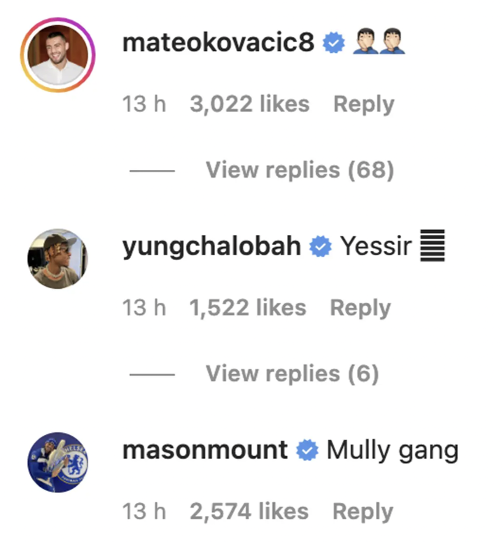 Mateo Kovacic, Trevoh Chalobah and Mason Mount react to Christian Pulisic's new haircut. (Instagram)
