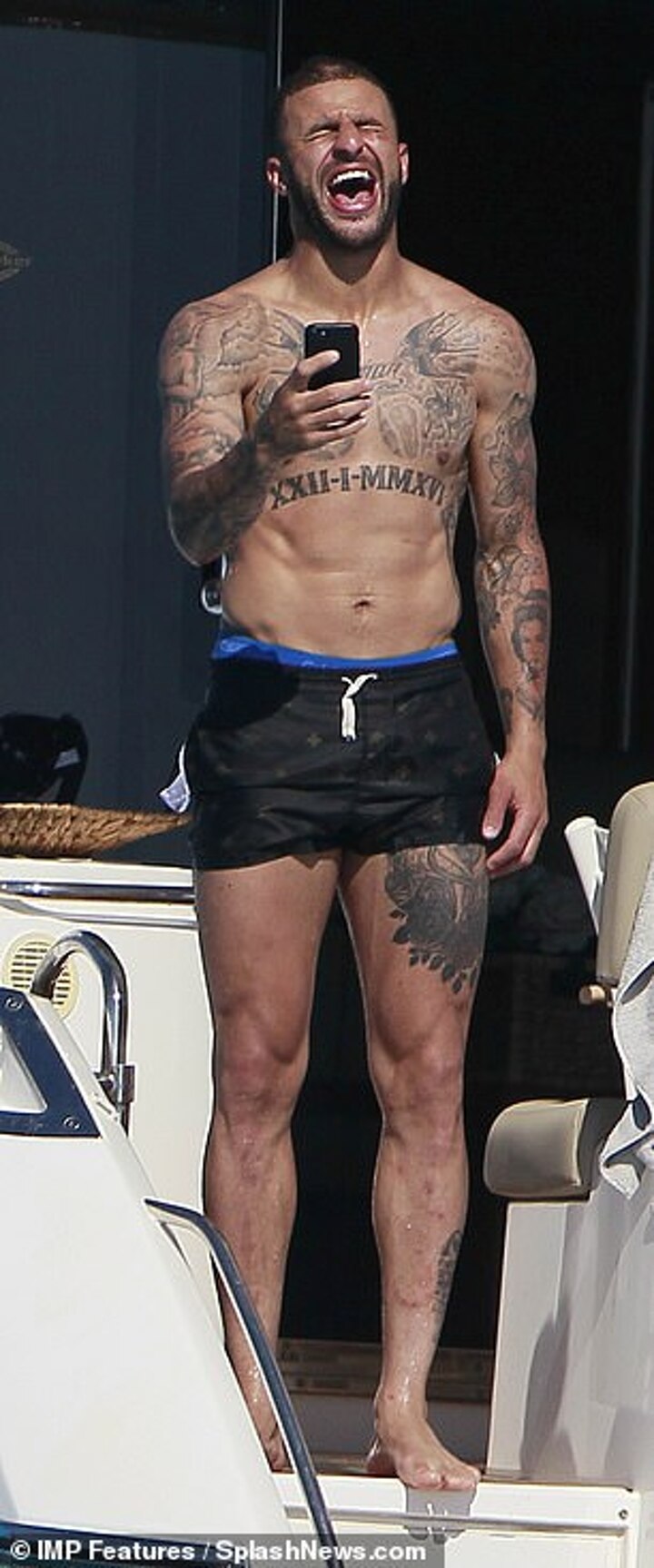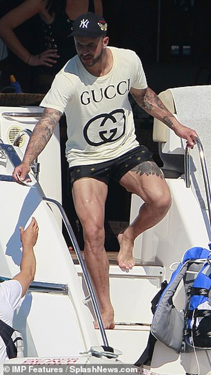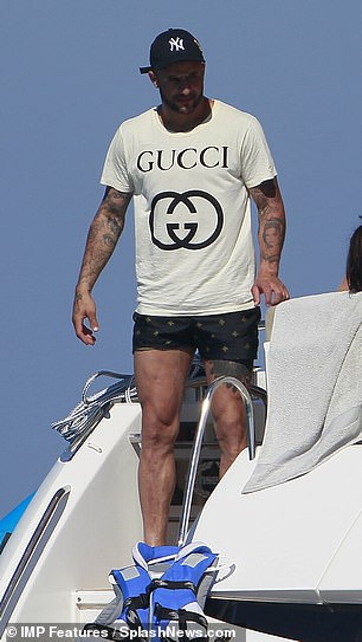The right back showed off his hunky, tattooed torso and muscular legs in a pair of tiny electric blue trimmed swimming trunks as he whiled away the afternoon.