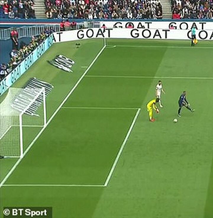 Mbappe quickly reacted by dribbling the ball away from the goalkeeper and passing into the empty net.