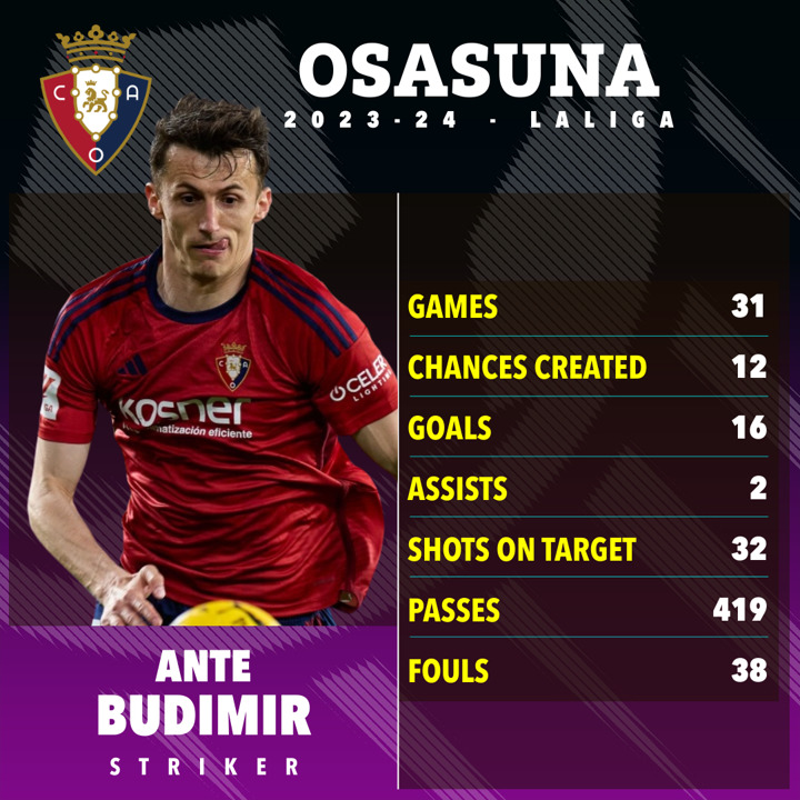 Budimir, joint second with Jude Bellingham in the Spanish top flights goalscoring charts with 16 goals and only behind Artem Dovbyk's 17, had previously scored three in three from 12 yards this season.