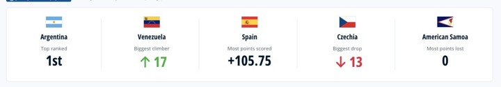Latest FIFA world rankings: Argentina remain in 1st, while Spain rise five spots.