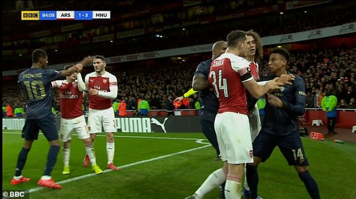 Towards the end of the game, with United leading 3-1, there was a contretemps between Arsenal defender Sead Kolasinac and United forward Marcus Rashford.