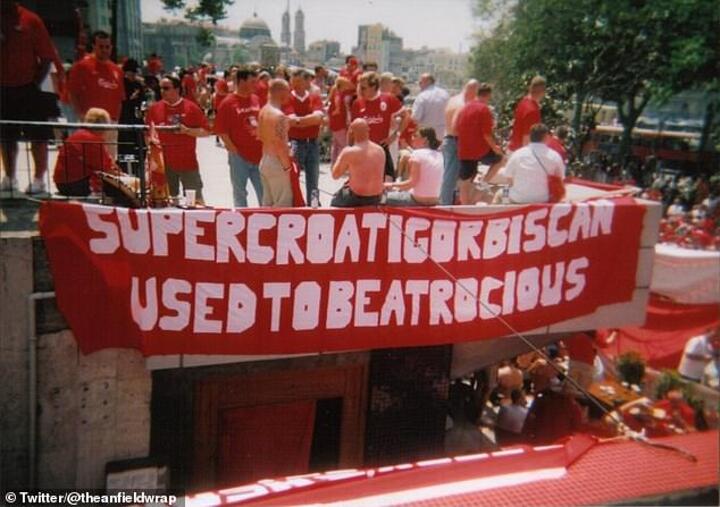 Riffing on the iconic Supercalifragilisticexpialidocious song from the Mary Poppins film, creative Scousers devised a banner which read: 'SuperCroatIgorBiscanUsedToBeAtrocious,' which was taken to the Ataturk for the European final.