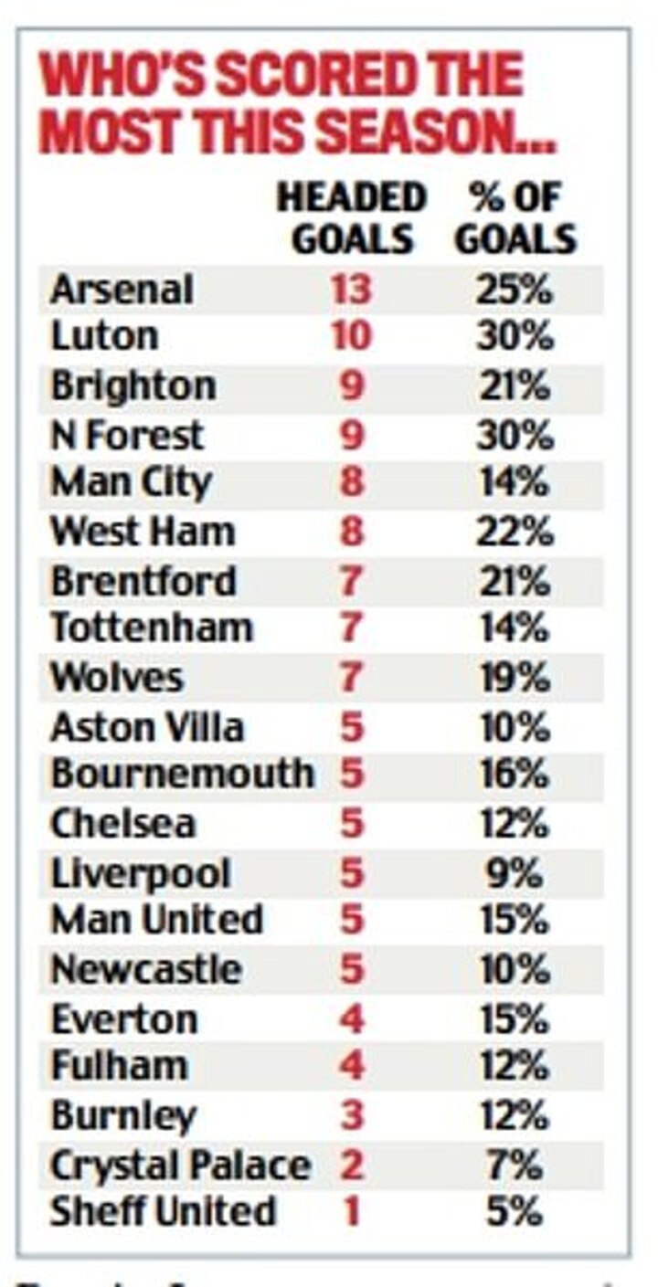 On the first weekend of February, there were nine headed goals in 10 Premier League games, representing 20 per cent of the 45 scored, five of them from set-pieces.
