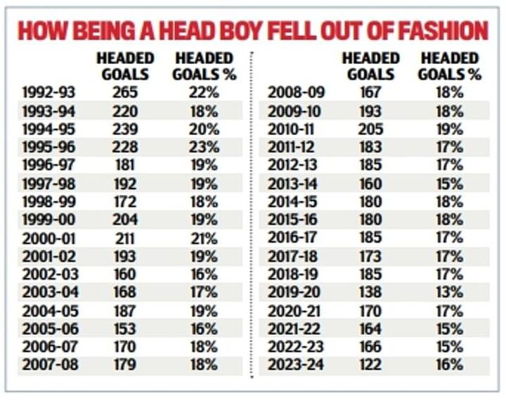Headed goals have not accounted for more than 20 per cent of Premier League goals since 2000-01. The 200-goal barrier has not been broken since 2010-11.
