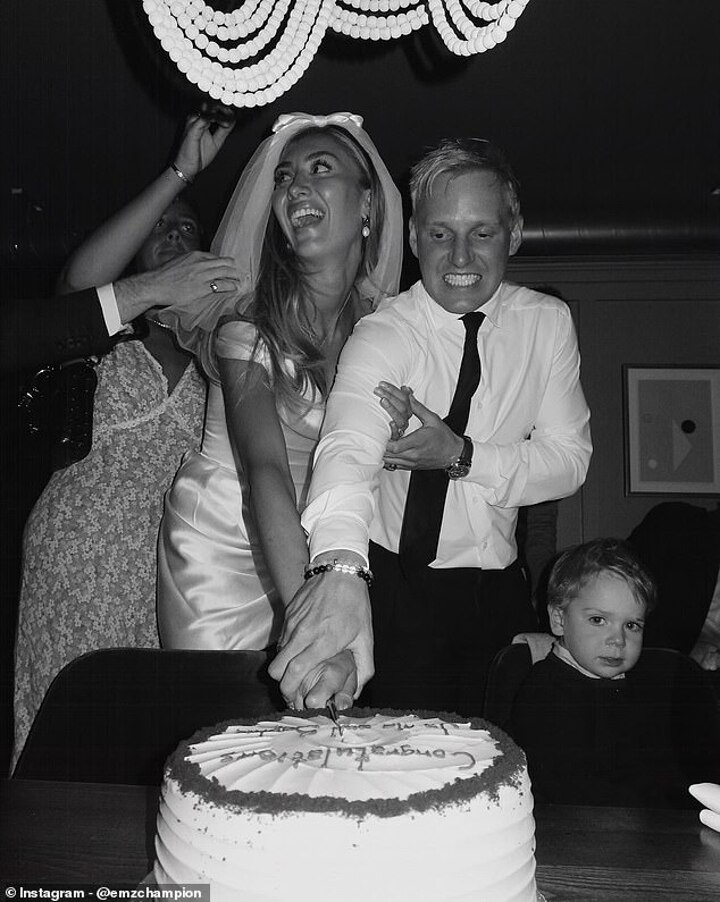 Looking effortlessly cool, the bride and groom were also snapped playfully cutting the cake, which had the word ‘Congratulations’ iced across it.