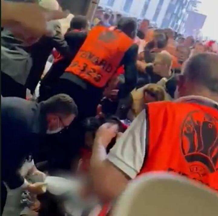 A horrifying video shows the moment Harry Maguire's father broke his ribs on the way to his Euro 2020 final seat, after he was caught in a stampede with thousands of ticketless fans trying to get into Wembley.