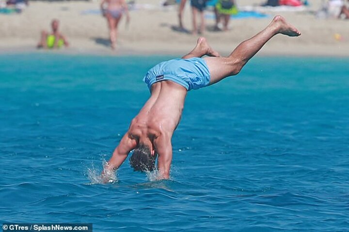 He proved he was very much a kid at heart during his holiday as he threw his adorable nephew into the air, before the pair leapt into the large body of water.