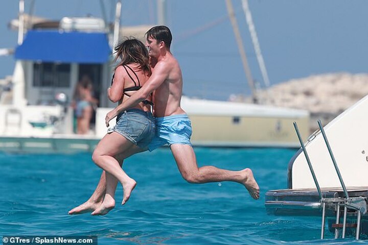 Appearing in high spirits, the mother-son duo couldn't contain their laughter as they flew into the Mediterranean Sea from the luxury AB 58 Kanamo watercraft.