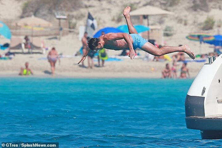 The Leicester City ace, 26 — who welcomed his daughter Lillie Saint with fiancée Fern Hawkins, 24, in April — was every inch the mummy's boy as he playfully jumped off a yacht and into the sea with his mother Zoe, 52, during their fun-filled trip.